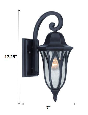 With this Matte Black Geometric Glass Wall Light you can elevate the look of your exterior walls in no time. The wall bracket has a simple rectangular design to which there is a curved spiral attached. The rod attaches to the top of the main body of the light. The top of the light has a geometric dome shape which extends down into a curved geometric frame. The bottom has a narrow ornament. Inside the frame there is a slightly frosted glass which adds character to the overall look of the light. Use this light on its own or in pairs around the outdoor spaces of your home. 17.25" H x 7" W x 8.75" D