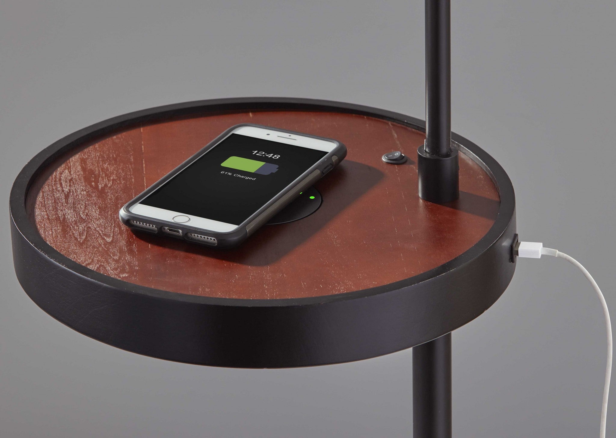 An essential addition to your living room, this Table Lamp includes a wireless charging pad with Qi inductive charging technology. A matte black finish is mixed with walnut wood for mid-century modern appeal. A natural fabric shade reveals its beautiful texture when lit. A 12.25" round shelf holds the wireless charging pad. Place this lamp next to your sofa for easily accessible storage and charging needs. Many smartphones (list below) have Qi technology built-in, so just place your phone on the pad and it will charge right up. All Charge product is Qi certified by the Wireless Power Consortium. The charge is unique in that you can use the Charge pad, the USB, and the light all at the same time with maximum efficiency of all three. An easily accessible rocker switch on the shelf turns the lamp on and off. Just plug in the lamp and the charger will work. This wireless charging pad will charge your phone through most materials, do you do not even need to remove your case! Only metal will hinder the function of the charging pad to charge through the case. If your smartphone doesnt support Qi wireless charging, you will need to purchase a Qi-compatible case, which is sold through a variety of retail channels. Or you can also charge your smartphone with the USB port that is also included in the lamp base. Compatible with Apple iPhone 8 / 8 plus / X / Galaxy Note 8 / S8 / S8 plus / S7 / S7 edge / S6 / S6 edge / S6 edge+ / Nexus 4 / 5 / 6 / 7 / LG G3/ Microsoft Lumia 1520, 1020, 930, 929, 928, 920