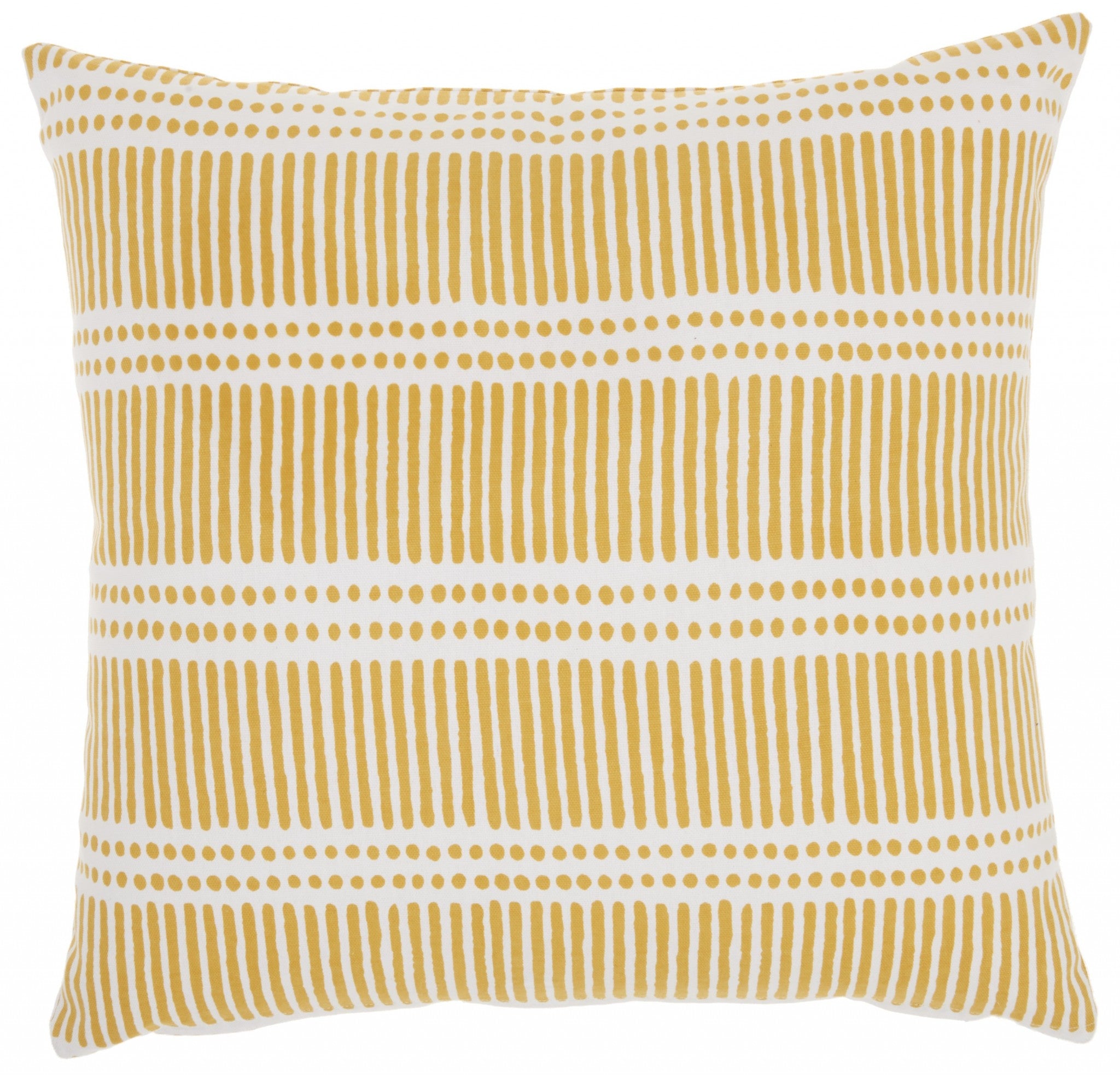 Induce a sense of freshness and comfort for your relaxing casual living space with the perfect Mustard Yellow Dots and Lines Throw Pillow. Bring the ambiance of spring and sunshine with the immaculate use of white and mustard yellow in a batik style pattern of slightly distressed stripes and dots. Made with 100% cotton, the piece is made to last while being fast and easy to clean. Using bold and bright colors with this piece is bound to make your casual look pop and create a welcoming environment. 18” x 18” x 5”