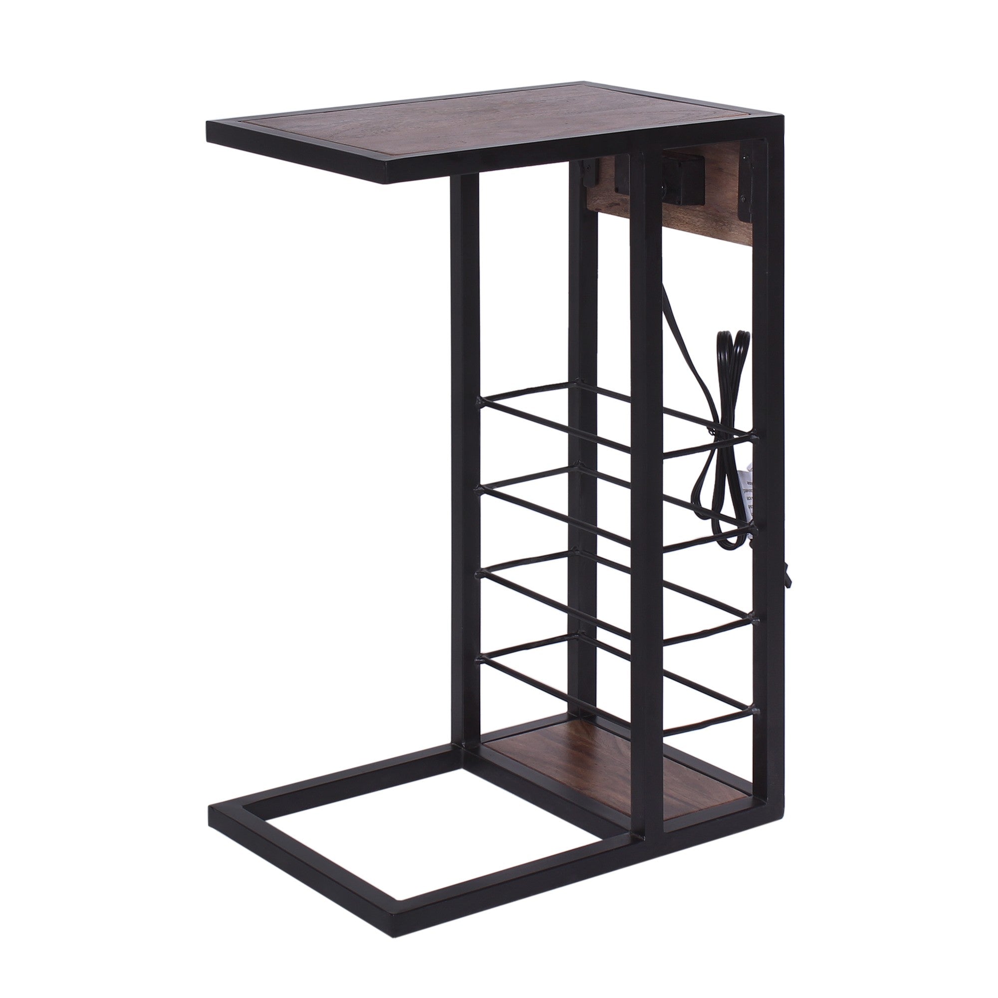 Modern Dark Wood and Metal End or Side Table with USB and Storage Rack