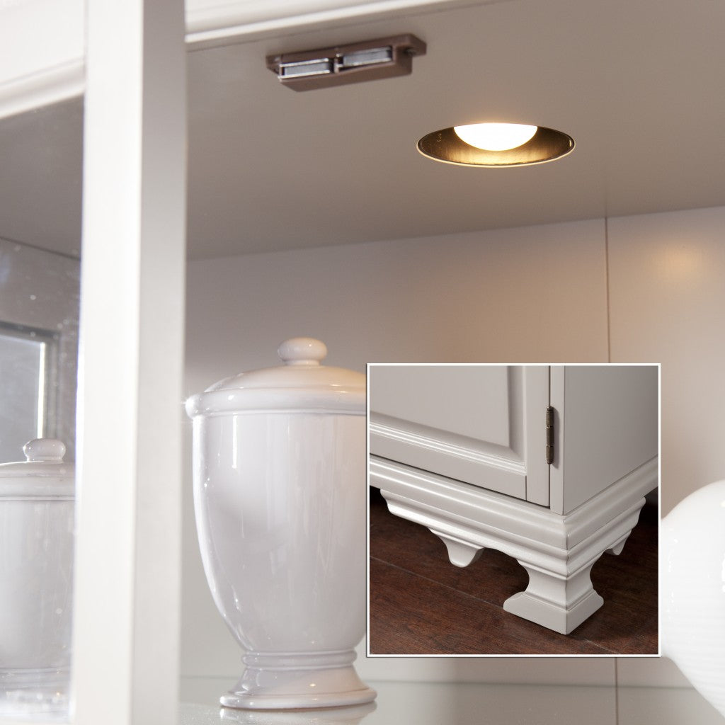 Traditionally carved and sweet, this Tall Modern Farmhouse Gray Classic Curio Cabinet is charming way to show off your dinneware, serveware and collectibles. The lit top cabinet display area includes four shelves behind glass panel double panel doors that also include peek a boo see thru sides as well. The lower cabinet features plenty of room for conceled storage as well. Finished in a light antiqued farmhouse gray, this pleasing cabinet is a display and storage wonder. 71.5" x 34.3" x 16"
