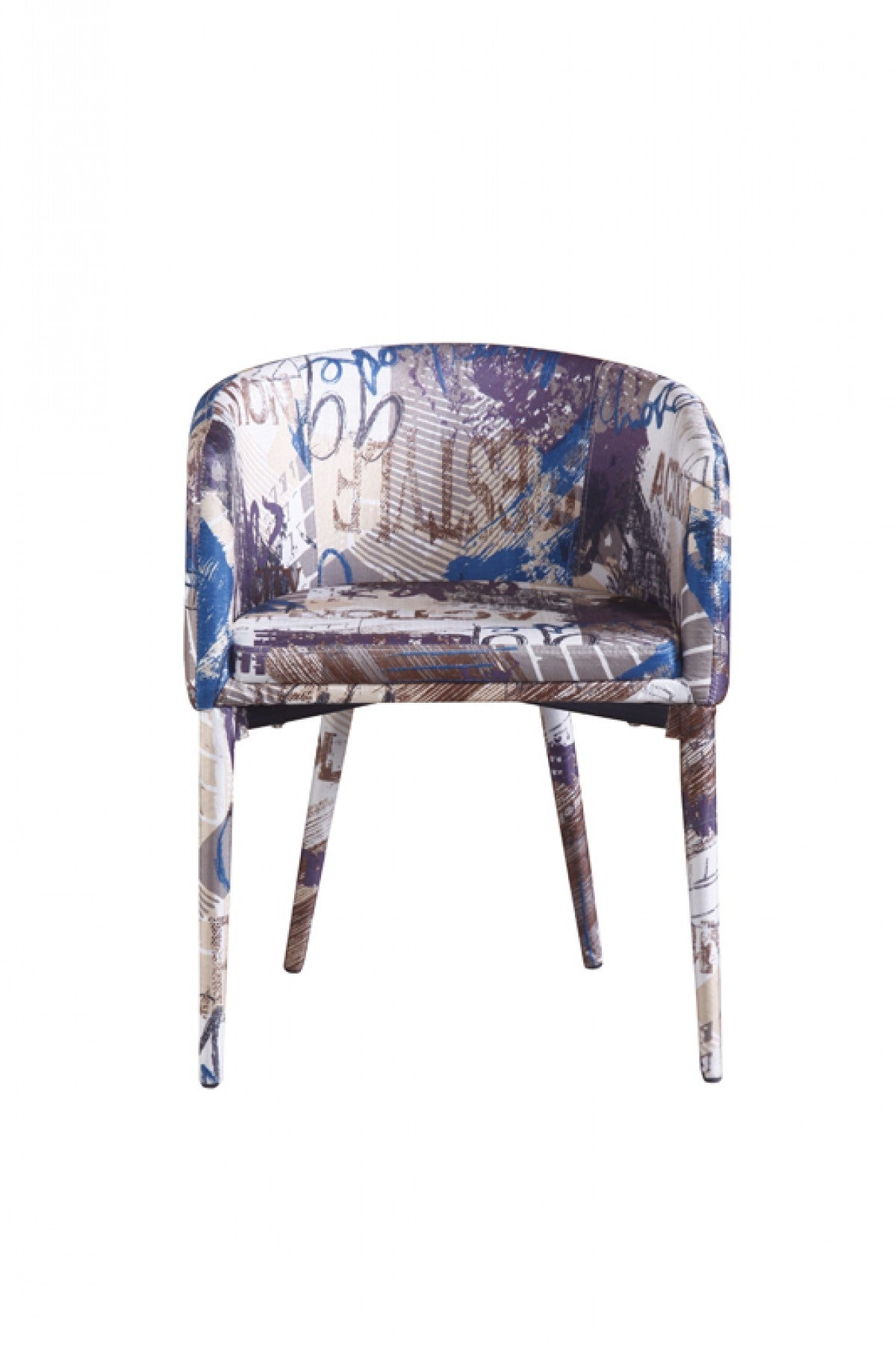 This fabric dining chair features a continuous back and arm design that seem to wrap you in comfort. Upholstered in multi-color patterned fabric, it stands on metal legs covered in the same fabric. Foot caps on legs prevent your floor from getting scratches. With a dimension of W18" x D21" x H28" and a seat height of 19".