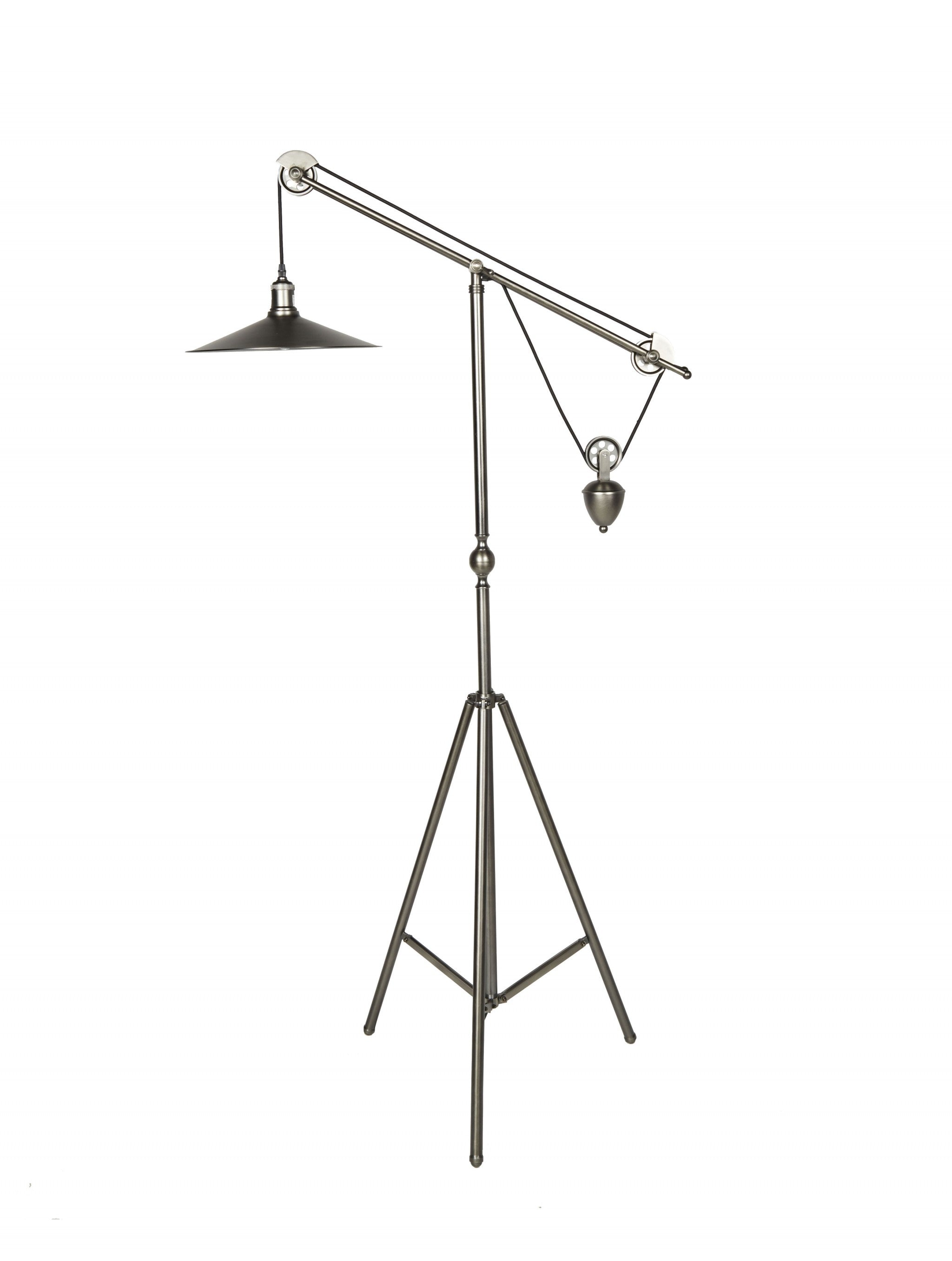 This high design industrial style Modern Tripod Pendant Floor lamp will introduce a warm, stylish and contemporary glow into your living space. With its conical metal shade hanging from a rod attached to a tripod legs, this pendant not only illuminates but adds a touch of cool to your living space. The height and angle of the shade is adjustable via a pulley system and the lamp comes with a brushed finish that fits modern decors, is practical, and becomes a piece of art in your space. Dimensions: 14" X 30" X 65". Bulbs required: yes, bulbs replaceable: yes, bulb type required: E-26, bulb count: 1, and bulb wattage: 40