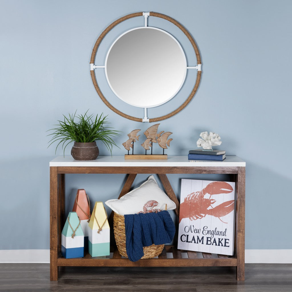 This Nautical Round Wall Mirror will take you back to the summer with its boat window shaped frame. This mirror has a frame that features a circular design which is made from durable white colored metal. The metal frame is covered with rope detailing which lends to the nautical theme very nicely. In the middle of the frame there is around mirror with a white metal border which connects to the main frame with four spokes. The mirror reflects light and brings in brightness and a feeling of space in any room you use it in. 32.68" H x 32.28" W x 0.87" D