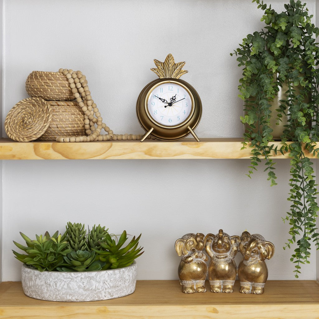 Surround yourself with positive energy and induce a sense of tranquility in the air with this Hear No Speak No See No Evil Golden Elephant Statue in your interior. Giving off a rich antique appeal, this tabletop figurine features 3 adorable elephants depicting a "See no evil, speak no evil, hear no evil" posture. The elephants are beautifully polished in a shiny gold finish with detailed decorative design patterns in white for visual appeal. Made with 55% resin and 45% stone powder, this sculpture ensures its durability for years to come. Having a decorative accent that reminds you of the moral values and goodness in life is indeed a worthy addition to your place. 6” x 9.50” x 3.25”