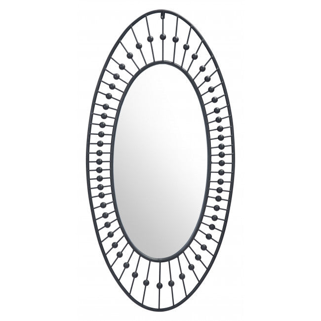 This Oval Black Finish Spokes and Beads Wall Mirror has an intricate design frame that's sure to add beauty and personality to any space. It has a stunning mirror of artistry that brightens any area it is placed. This astonishing piece features black wire spokes and beads that give your space an open feel. It improves your bedroom entryway living room or any corner it's placed. 47.2" H x 23.6" W x 1.4" D.