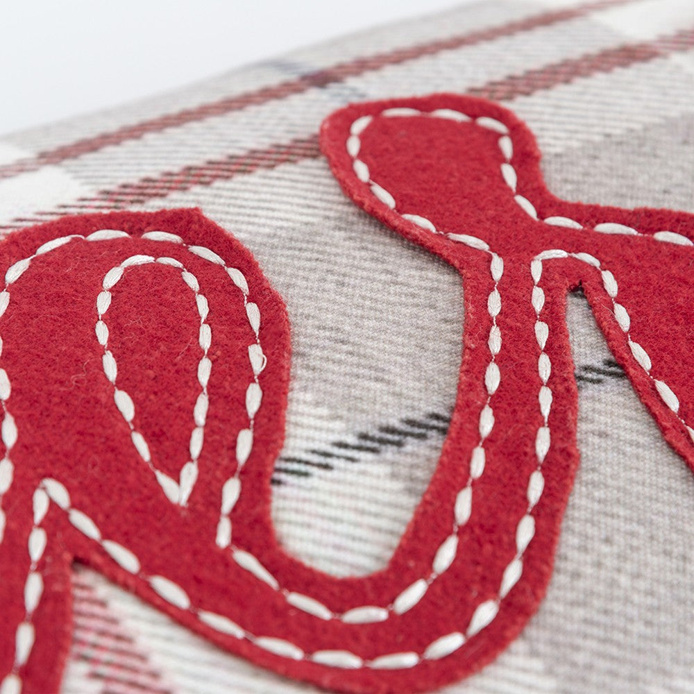 Fun and festive, this Red and Gray Christmas Plaid Lumbar Throw Pillow is a great way to accent your space for the holidays. Pretty appliqued red felt script with white stitching reads "merry" to help spread the holidy cheer while red piping around the edge finishes off the festive look. Designed for low back lumbar comfort, this rectangular 14" x 26" decorative accent features a solid natural canvas color back with a hidden zipper closure for convenience.