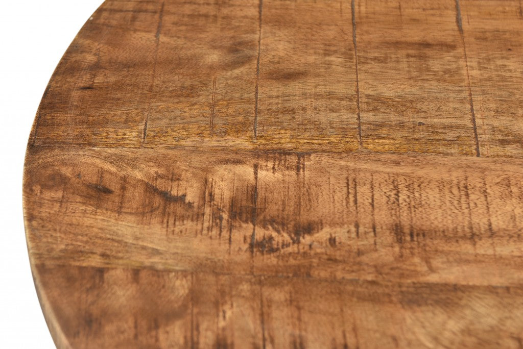 Characterized by a minimalist silhouette with a distressed natural element, this Round Mid Century Iron Base Coffee Table accentuates a modern-rustic tone to compliment a myriad of interior decors. The round tabletop in a medium-stained wooden finish is combined with a uniquely designed iron base for style and durability. This eye-catching coffee table is ideal for serving snacks and drinks to guests or displaying potted tops, photo frames, figurines, or ashtrays to enhance the aesthetics of your living room. The industrial-inspired design and metallic accents of this coffee table make it a versatile piece of décor to set an inviting tone into your home. 32” x 32” x 18”