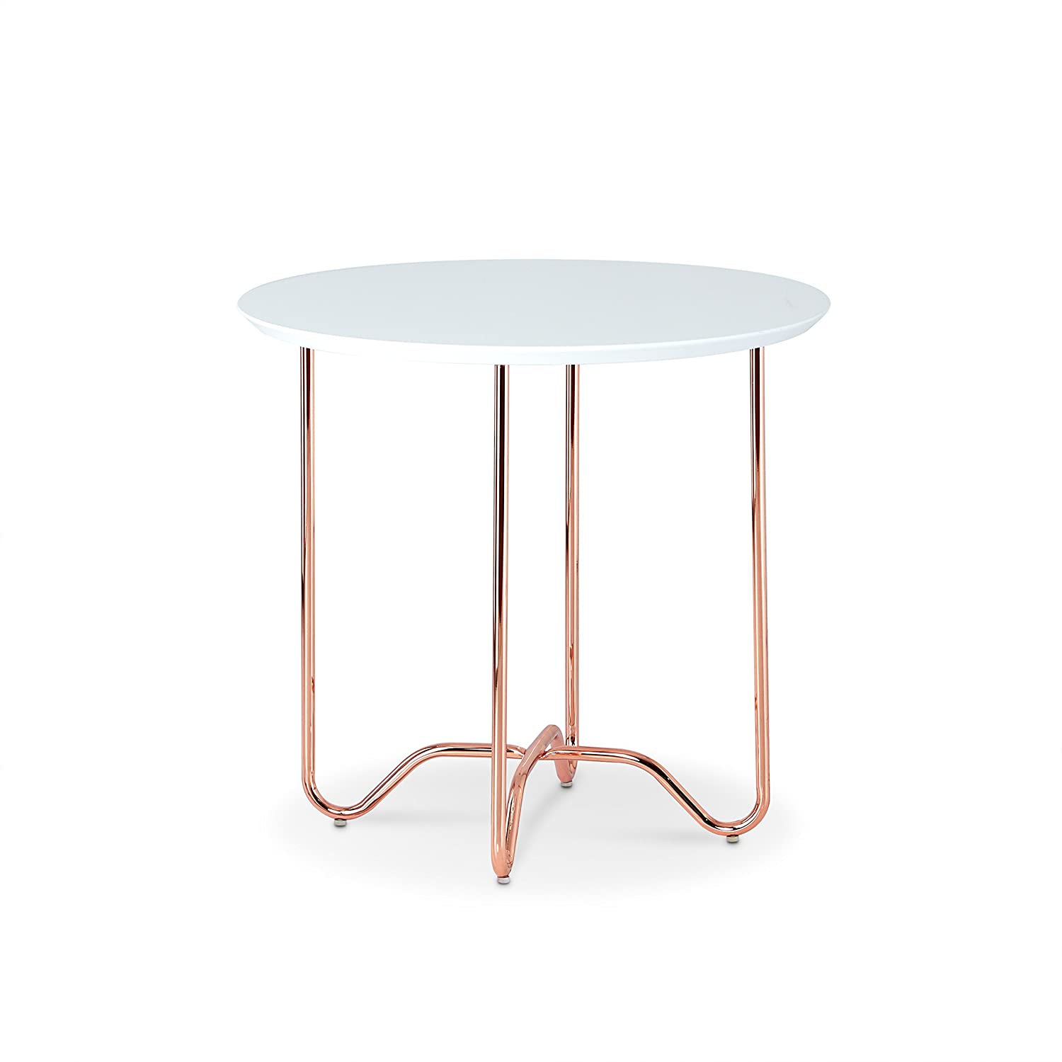 This Round White Side Table strikes a perfect balance between an industrial yet glamorous look thanks to it's rose gold iron legs. While simple in design, the contrasting color pallette means it will add a unique touch to any room while also easily complimenting existing interiors. Perfect as a small coffee table but also a beautiful night stand in a bedroom. 19" x 21" x 21"