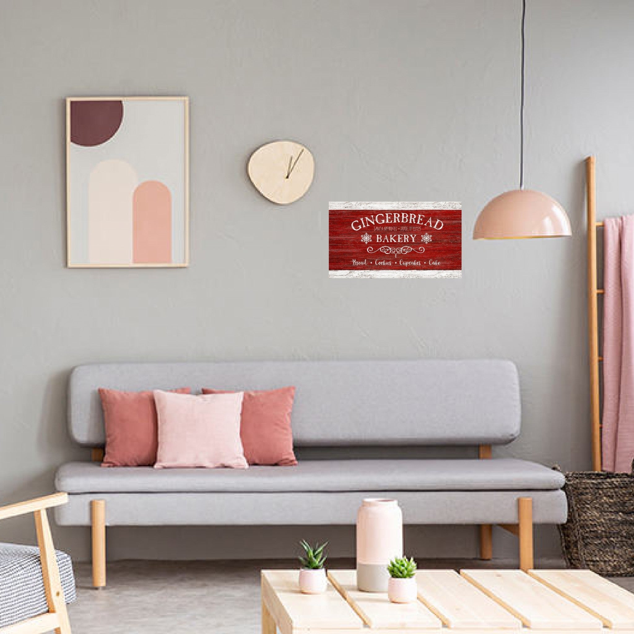 Add some fun and festive decor for the holidays with this Rustic Vintage Gingerbread Red and White Wall Art. This Santa approved Gingerbread Bakery wall plaque is printed directly on distressed wood panels with all of their knots and imperfections, giving this art a vintage and weathered feel. Warm up the hot cocoa now and enjoy the Christmas season with this unique and smile producing home decor. Comes ready to hang but will also be great leaning on the mantel or counter top. 15" x 26" x 2"