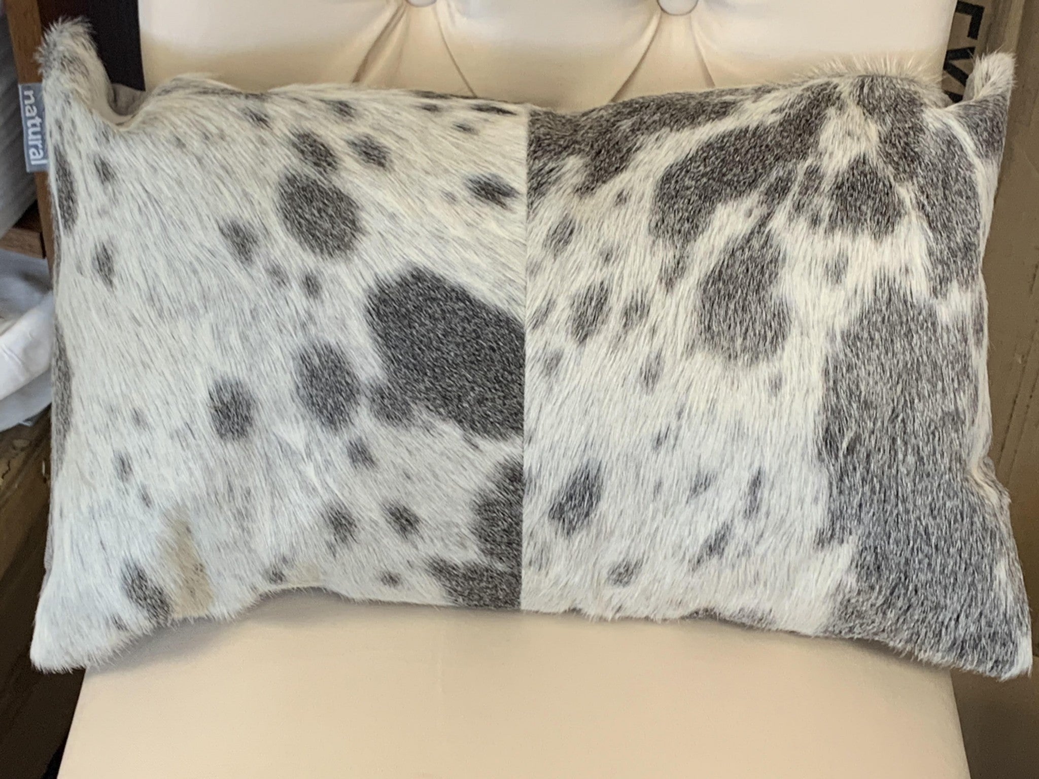 Spice up your room with our Gray And White Natural Cowhide Pillows. Designed with the essence of luxury, these lumbar decorative throw pillows are made only from the finest natural cowhide that prides itself on a naturally soft and smooth pile depth of color. Each pillow is hand stitched by skilled artisans, has a soft microsude backing, and features a concealed zipper closure that allows for easy removal for cleaning. Enjoy the luxuriousness and uniqueness of genuine natural cowhide with these durable and enduring pillows. No two will be exactly. Set of 2 12" x 20" x 5"