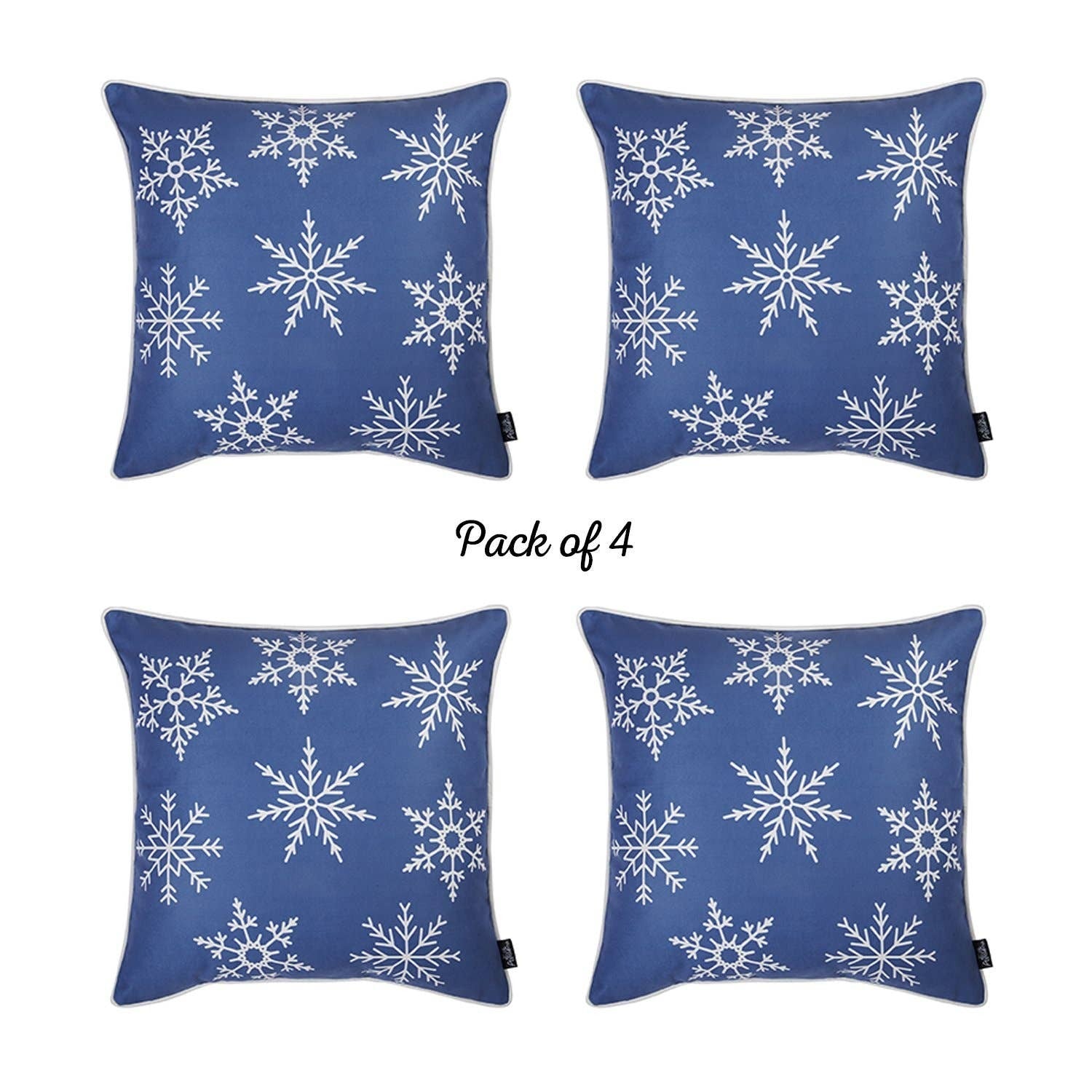 Upgrade your home with this elegantly designed Set of 4 Blue and White Snowflakes Throw Pillows, which will be an ideal accent to add a luxurious tone to your decor. The stunning azure blue base is accented by white snowflakes motif for a striking contrast that's sure to allure the gaze, while the white piped edging gives this piece a definitive look. The all-around hidden zipper closure and soft poly filing inside add to a seamless finish and fluffy appearance. Crafted with care by Turkish artisans, this decorative pillow features a premium polyester material, which makes this piece hard-wearing and easy to clean. You can be confident in the product's quality because it is OEKO-TEX Standard 100 certified. This charming pillow set will give your living space a festive vibe and earn you loads of compliments from the guests. 18” x 18” x 1” each. Set of 4.