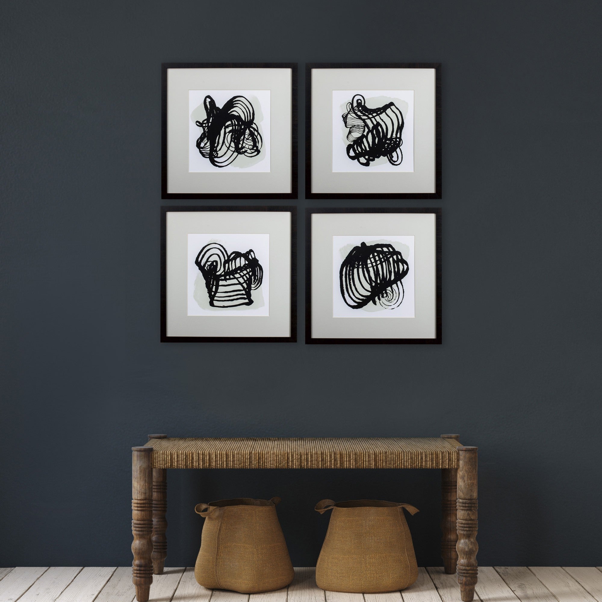 Contemporary and unique, this Set of Four Black Abstract Swirls Wall Art will liven up your space. They are single matted and complete with a brown frame. The coordinating set can be hung together or used separately as you choose. 26" x 26" x 1" each. Set of 4.