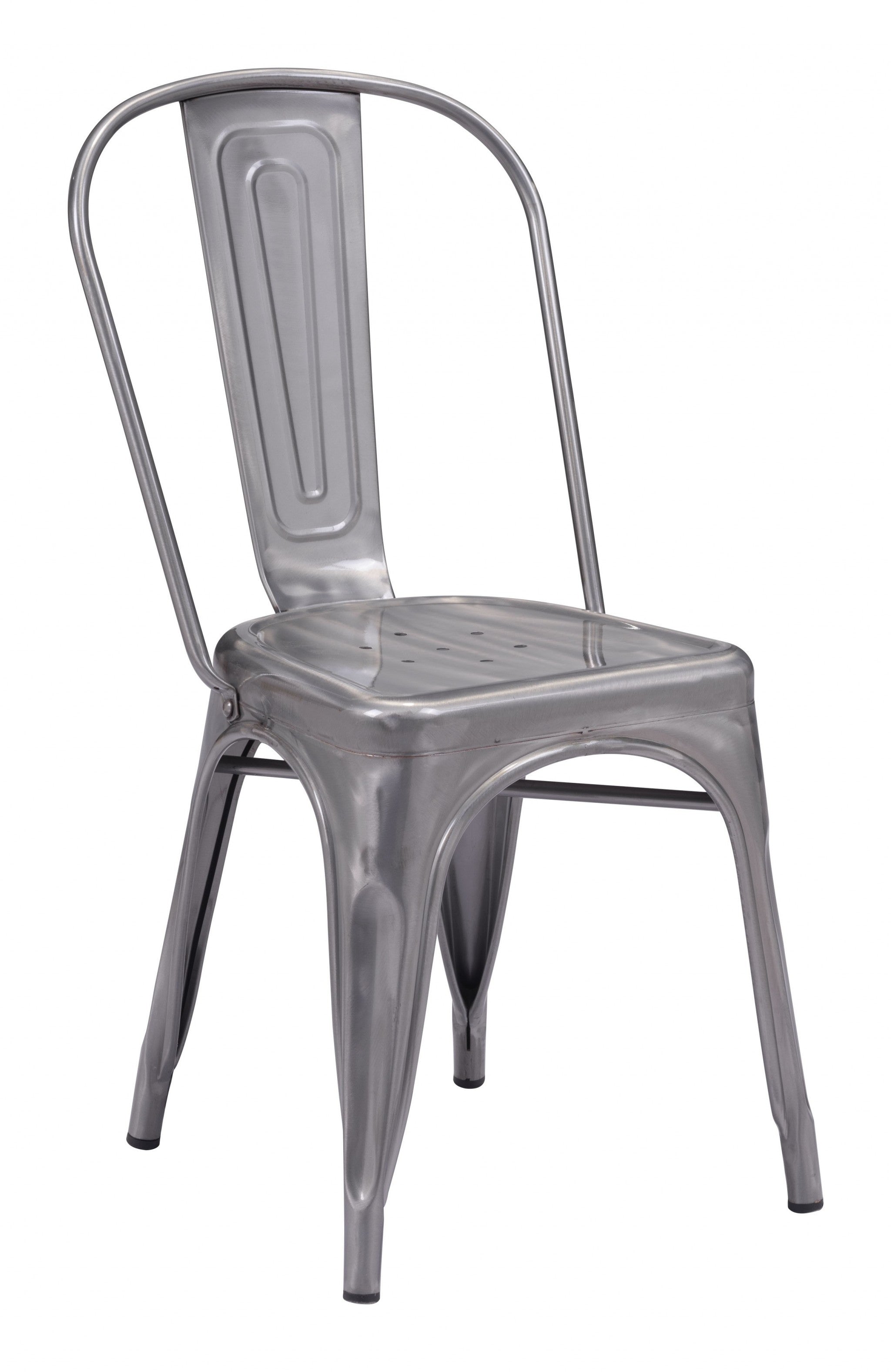 Add a touch of industrial bistro design to your home with this Set of Two Bistro Gray Steel Dining Chairs. There are two chairs in this set and they are both made of solid steel finished with a shiny gunmetal gray color. The base of each chair has four legs that are tapered towards the bottom. The seat extends into the legs to create a seamless design. There is a thin frame that curves around as the back support with a wider steel plank in the middle for better spine support. Use these chairs anywhere in your home to add updated casual chic. 33.9" H x 17.3" W x 20.5" D