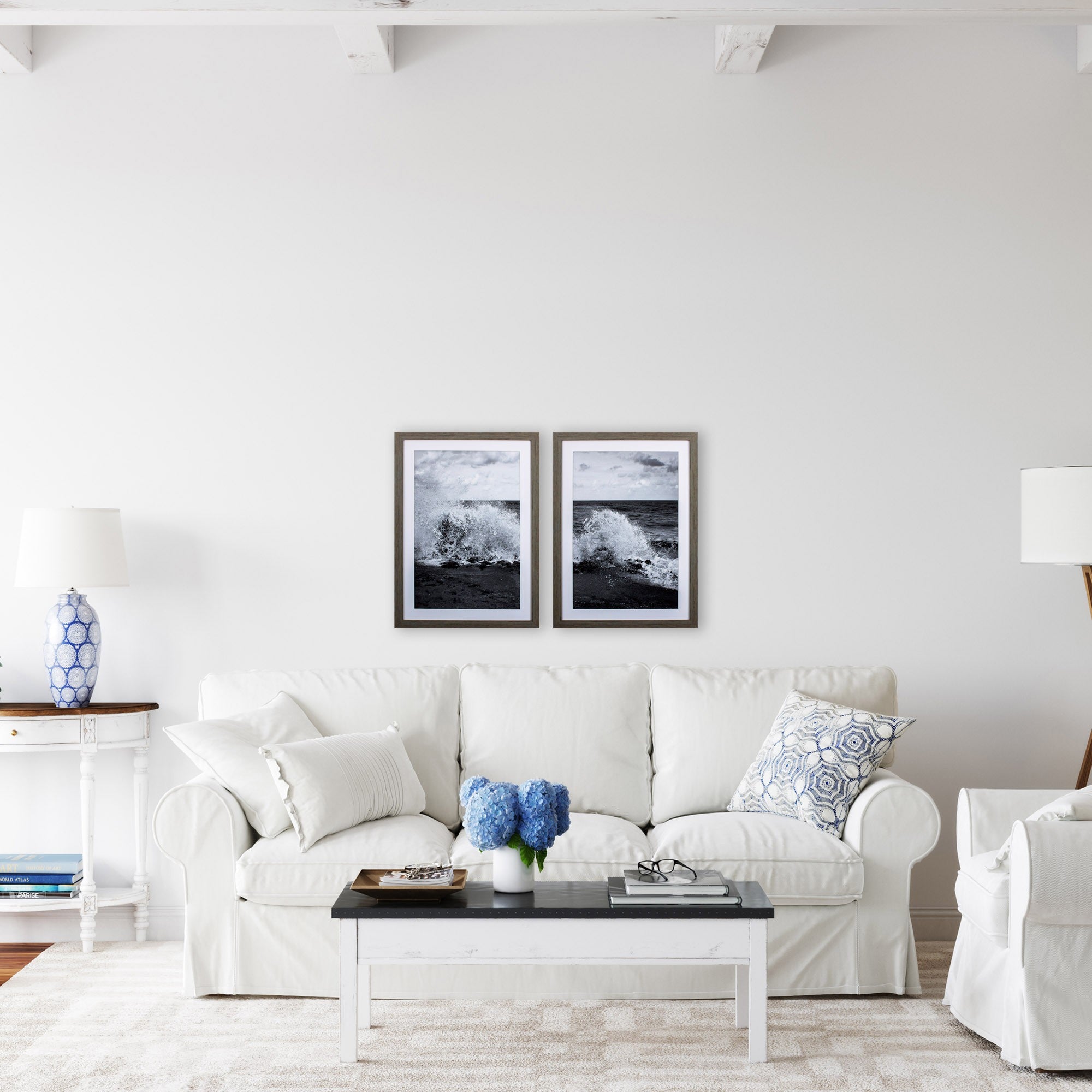 Set of Two Black and White Crashing Waves Wall Art is a great way to bring that coastal and nautical feel into your space. These prints are single-matted and complete with a distressed wood frame. This amazing view of crashing waves will be a great addition to almost any room, especially in beach and tropical locations or anywhere you want to remind yourself of the great ocean. 36" x 26" x 1" each. Set of 2.
