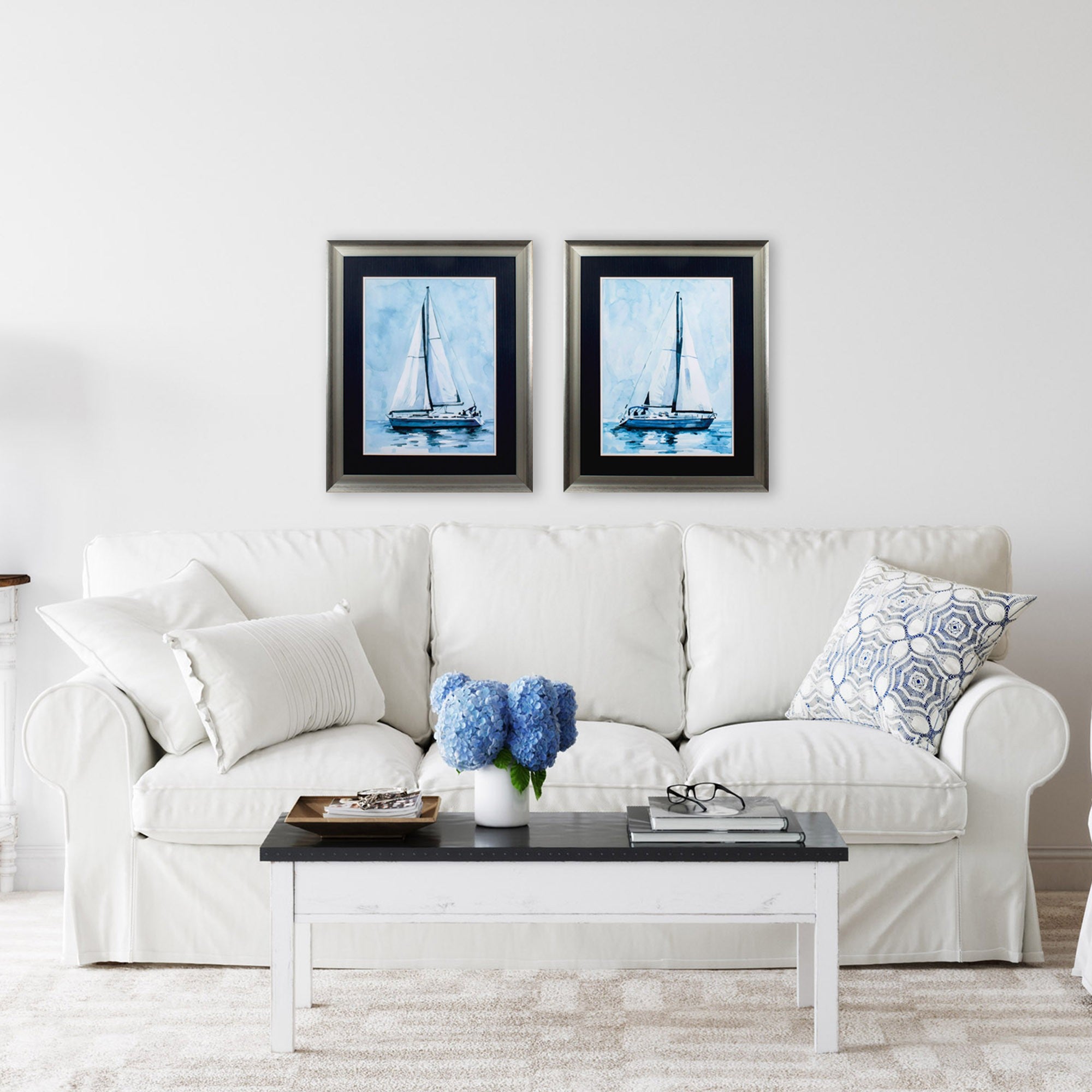 Set of Two Blue Watercolor Sailboats Wall Art is a great way to bring that coastal, nautical, and beach feel into your space. This print is double-matted, framed under glass, and complete with a silver moulding. This amazing view of sailboats will be a great addition to almost any room, especially in beach and coastal locations. 34" x 28" x 1".