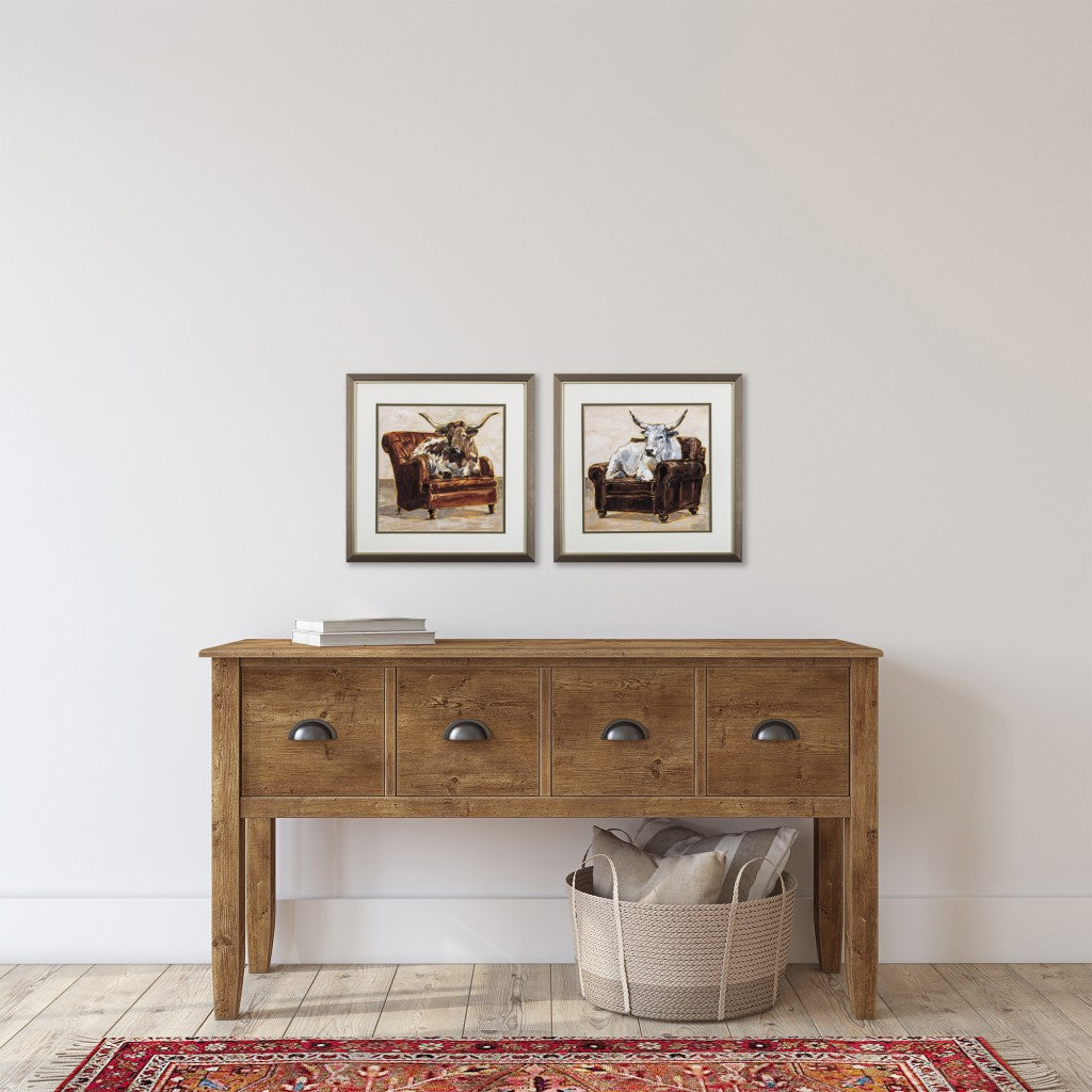 Bulls On a Chair Watercolor Wall Art is a great way to bring that country and western feel into your space. Double matted and framed under glass in a metallic bronze frame, this unique set of two different bulls sitting on chairs will be a great addition to almost any room. The coordinating set can be hung together or used separately as you choose. 17" x 17" x 1" each. Set of 2.