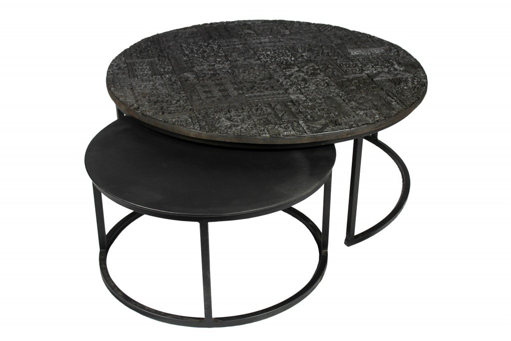 Glamorous with a hint of mystery, this pair of Modern Black Round Nesting Tables is the perfect way to add some excitement to your space. With an industrial design aesthetic these geometric base round tables nest into each other or can be used separately. Both in black the larger one has etched patterning across the tabletop while the smaller one has a solid black tabletop. The combination of the two makes a refereshing contrast of pattern and solid that give this set an edginess and uniquness that is sure to turn heads. Smaller Table: 14”H X 28”W x 28”D Larger Table 2: 16”H X 42”W x 42”D x