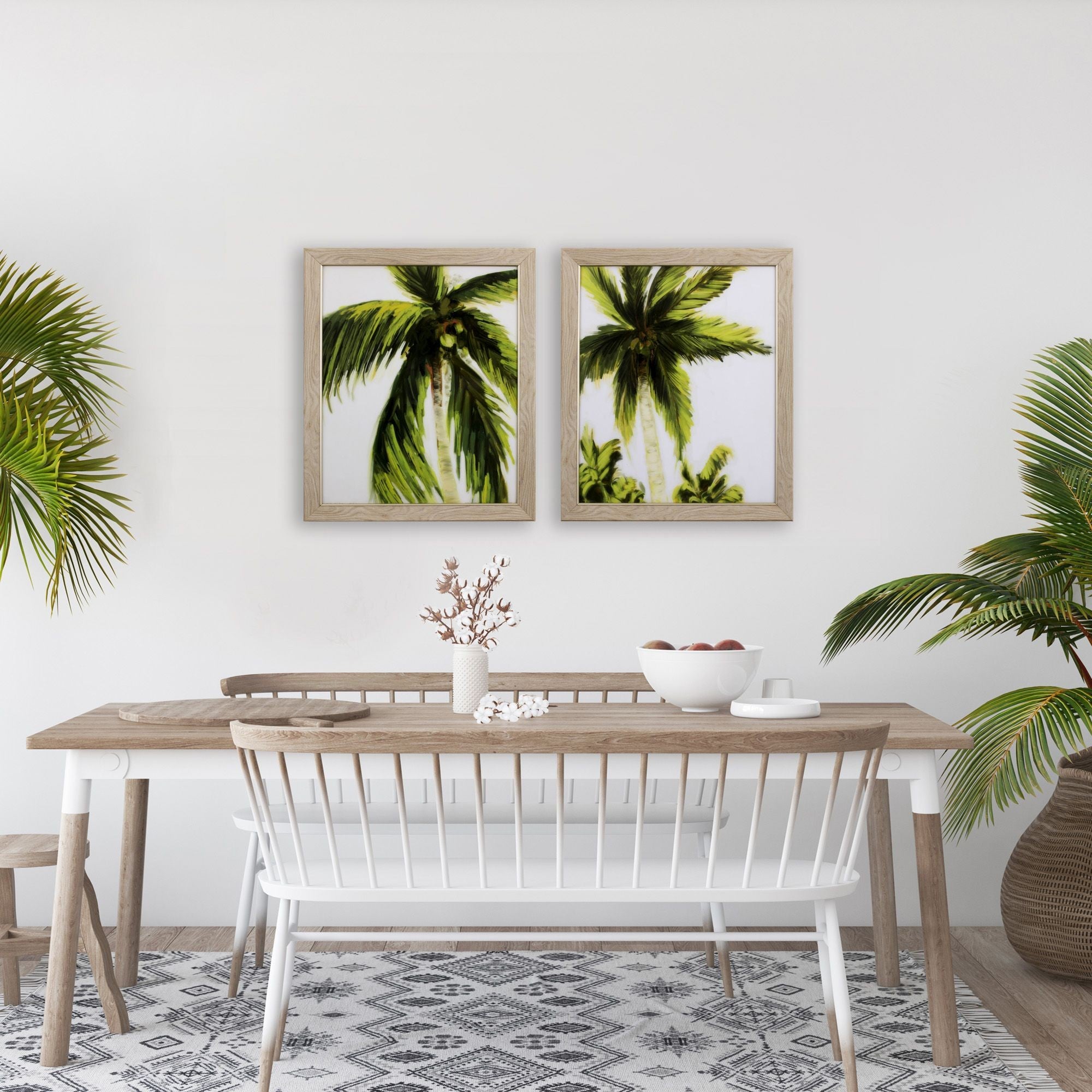 Palm Trees Wall Art is a great way to bring that coastal, tropical, and beach feel into your space. Single matted and framed under glass in a distressed wood frame, this adorable image of the palm trees will be a great addition to almost any room. The coordinating set can be hung together or used separately as you choose. 23" x 19" x 1" each. Set of 2.
