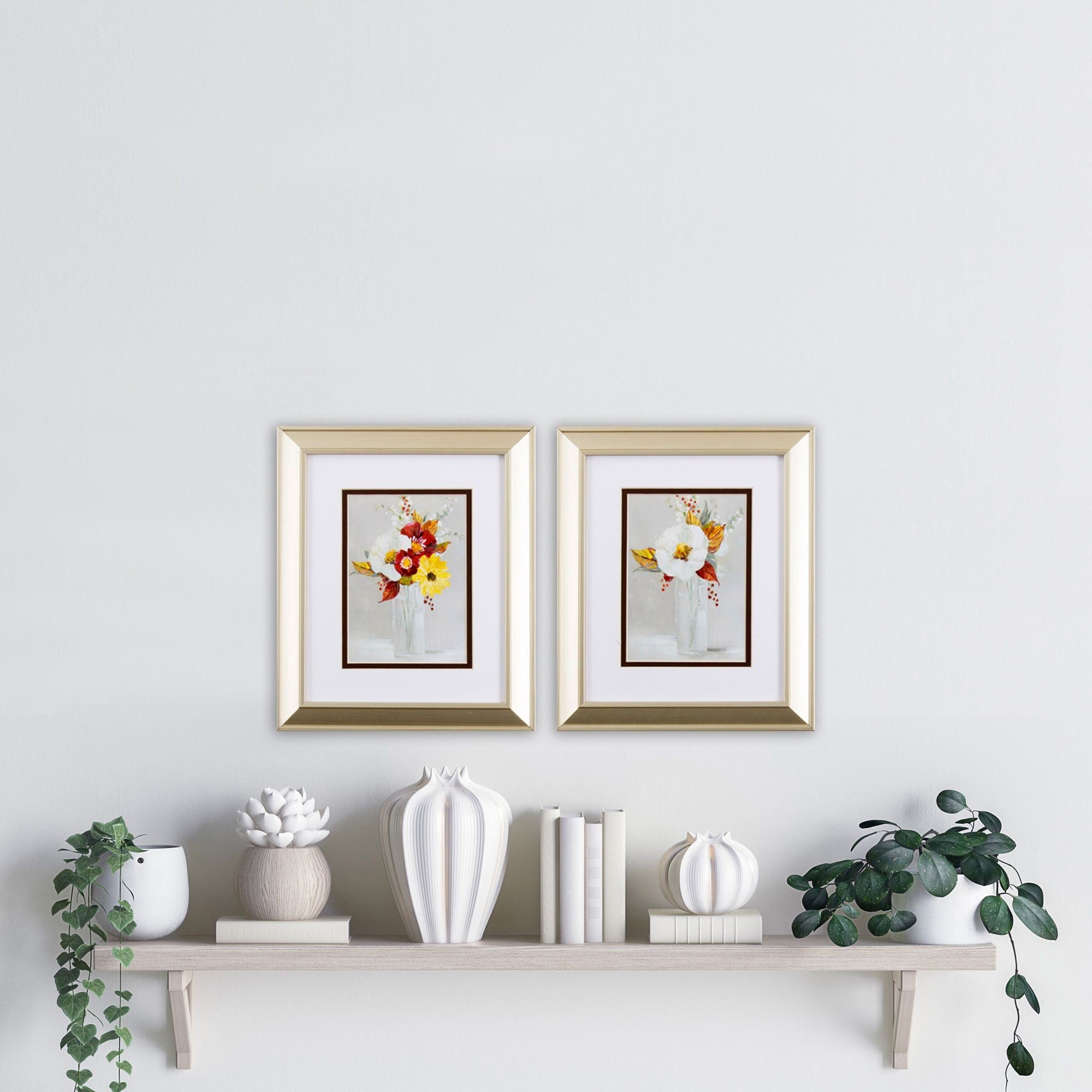Add some visual interest to your space with this Set of Two Watercolor Harvest Flowers Wall Art. Framed under glass in a rustic and champagne frame, these gorgeous red, yellow, orange, and white color flowers are double matted and will look great in almost any room. The coordinating set can be hung together or used separately as you choose. 12" x 10" x 1" each. Set of 2.