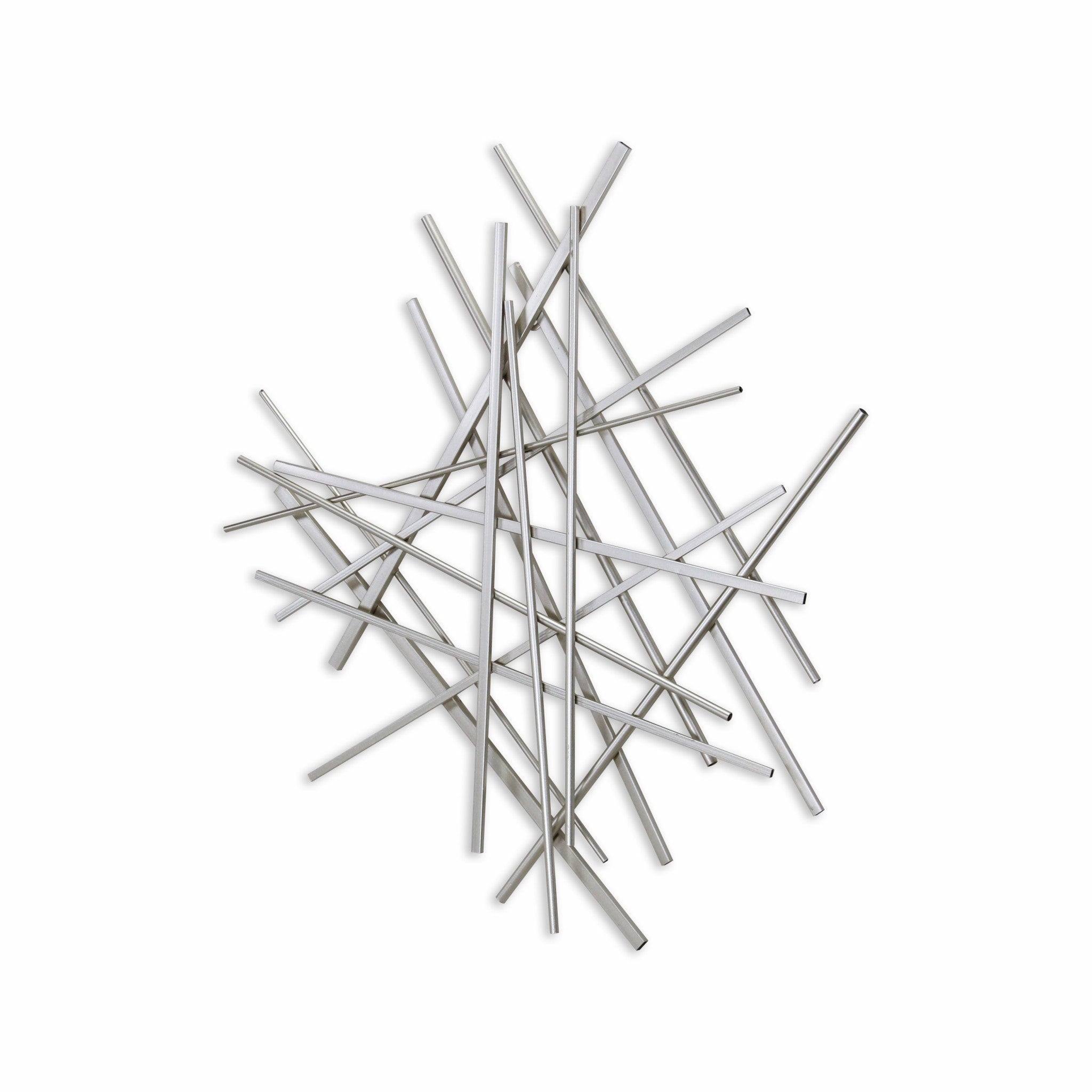 The perfect way to add some contemporary decor to any wall in your home, this Silver Rod Abstract Wall Decor is made from a collection of solid metal rods. These metal rods all intersect each other at random points which gives this piece a very textured look. The smooth shiny silver finish has an almost reflective effect to it. This piece will look great as part of your already existing wall decor or you can it as a statement piece in any space you see fit. 28.5" H x 26.5" W x 1.25" D