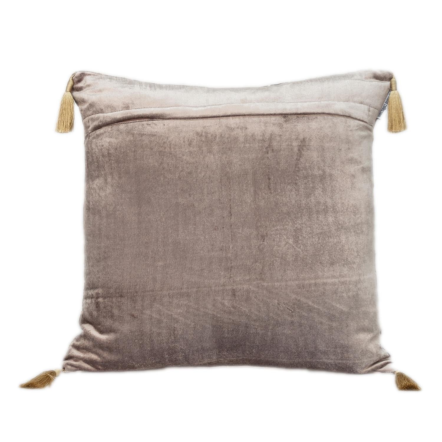 Luxury meets simplicity with the Taupe and Gold Geo Velvet Throw Pillow with Gold Tassels. Beautifully handcrafted from an all velvet base, the pillow gracefully evokes a sense of charm and brings forth a little drama into your diverse space. Fascinating gold geometric patterns stitched on the soft velvet leaves a mesmerizing effect while adding character to your room. Four gold tassels adorn the four corners of the pillow that enhance the plush level. Concealed on the back is a hidden zipper under a neatly designed flap, provided for easy cleaning and removal. Enliven your home by pairing this pillow with your favorite pastel shaded decors. 12" x 24" x 4"