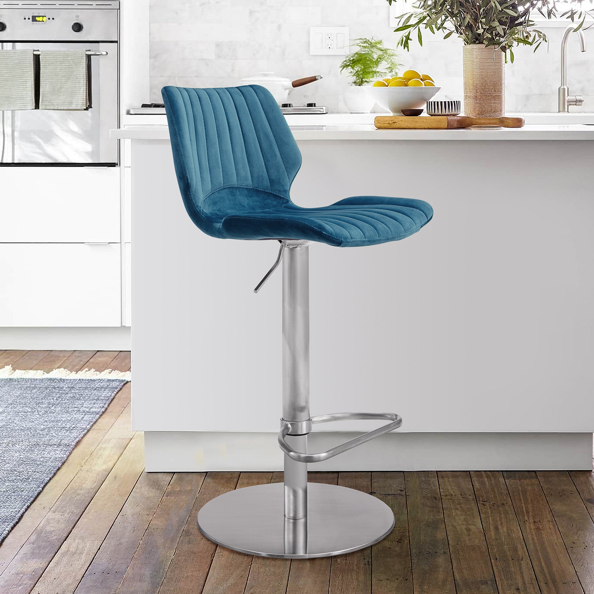 Flaunt your taste in modern designs and styles with this Teal Blue Velvet and Chrome Channel Stitch Adjustable Swivel Bar Stool. The modern armless velvet chair features vibrant color and channel tufted stitching on the seat and backrest that pairs perfectly with the stainless steel pedestal base and footrest. Every element of this stool combines well to add a touch of class to your home bar, kitchen counter, or wherever you decide to place it. Enjoy comfort in the most exciting way with the stool's 360-degree swivel function. 42" x 18" x 20"