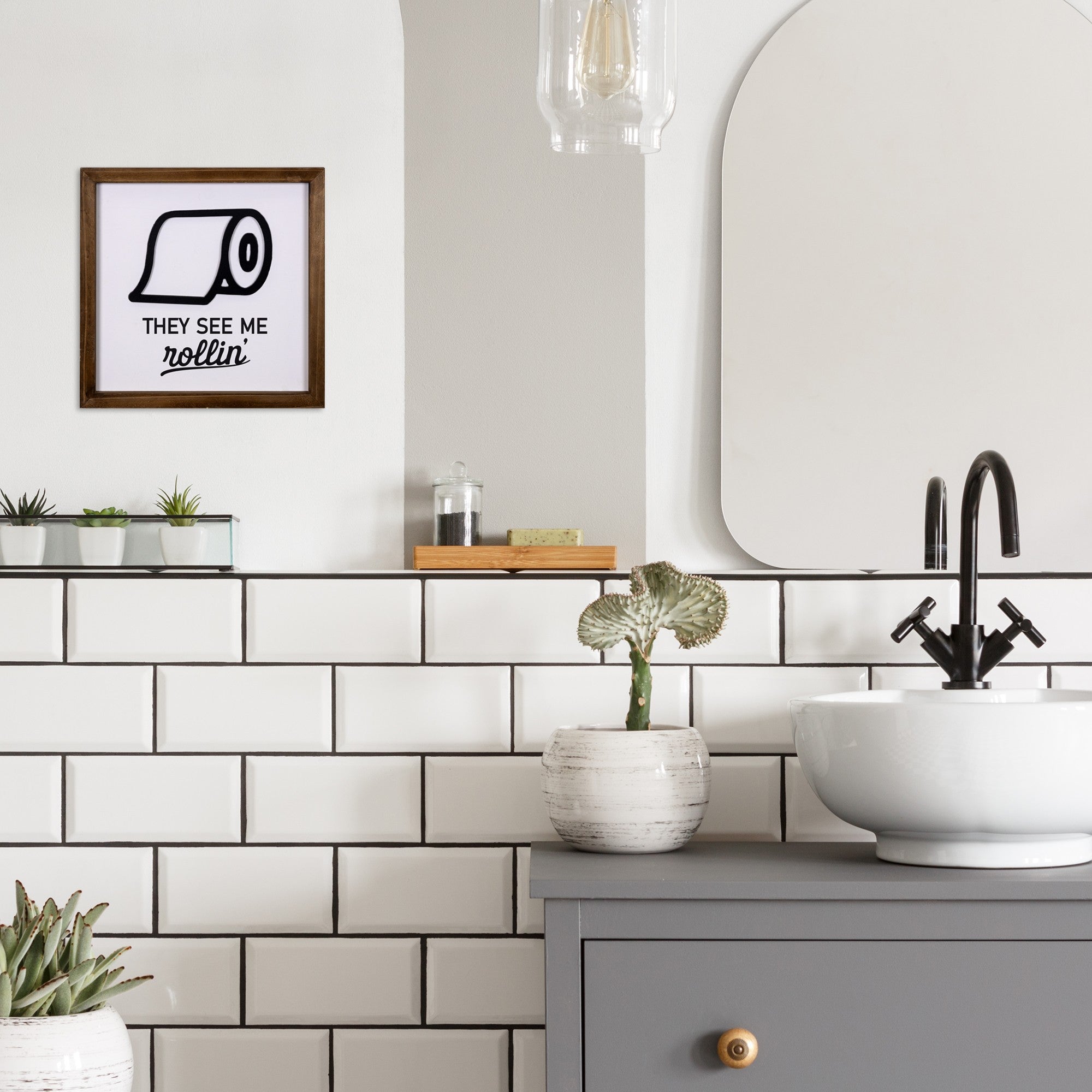 Add a touch of whimsical design to the walls of any bathroom of your home with this They See Me Rollin' Framed Wall Art. The frame of this piece is made from wood and is colored to a dark brown varnish that allows the wood grain to show through. Inside there is a plain white background which is perfect for the simple black line drawing and font on top. The drawing is of a toilet roll slightly unraveled with the words 'They See Me Rollin'' written below it in two different fonts for added dimension. This fun wall art will be a great one for your guest bathroom or powder room or you can use it in your own bathroom for added design and whimsy. 12" H x 12" W x 0.88" D