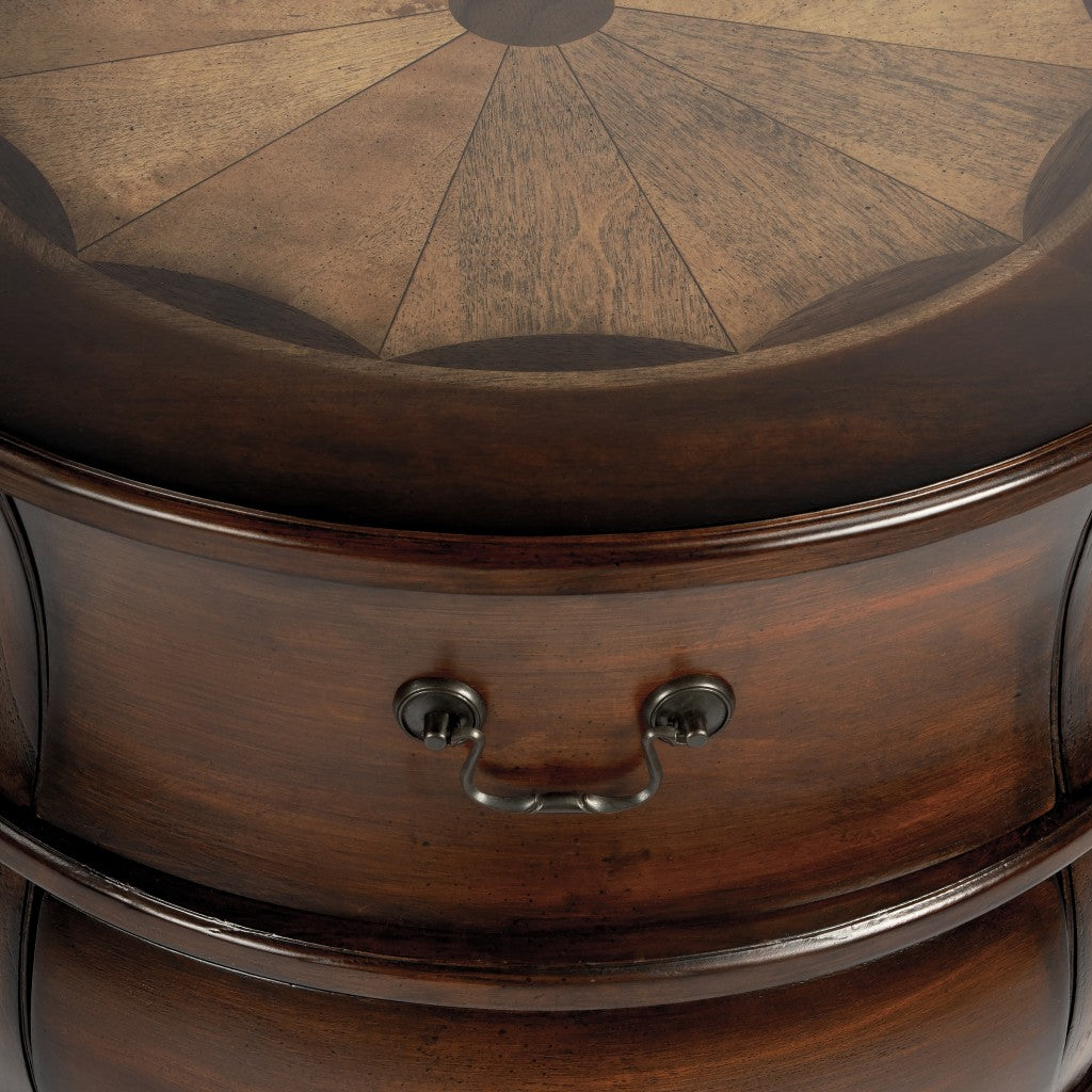 A nightstand, a center table or an accent table, the Traditional Cherry Barrel Table makes the perfect addition to any room it is positioned in. This period styled table has a unique and elegant structure. Crafted from poplar hardwood solids and inlays of maple and walnut veneers it adds a vintage touch to your home. Three drawers with rich Traditional cherry finish and bail pull antique brass handles provide ample space for all your storage needs. 26.5" x 24" x 24"
