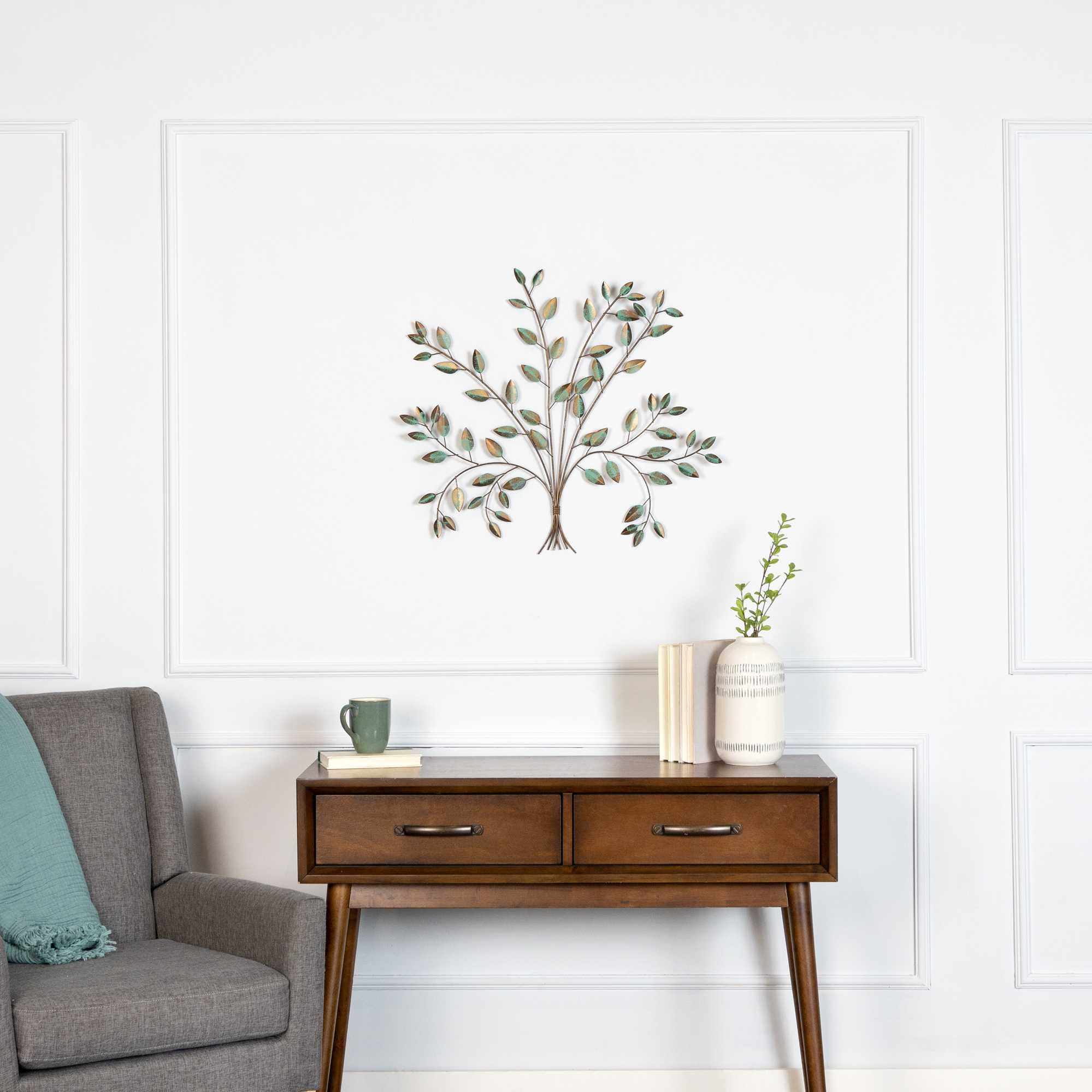 Solidify the beauty of your chamber with this well-crafted tree of life wall decor. Our handcrafted metal wall art is designed to create scenic atmosphere that will constantly showcase a charming piece that warms the heart. It features a profile detailing metal tree branches and leaves with a touch of gold and teal that adds enduring style to any room. Transitional style Handcrafted of metal Comes ready to hang Attached keyhole hanging method Vertical hanging orientation Wipe clean with damp cloth. It measures 24" X 0.5" X 24".