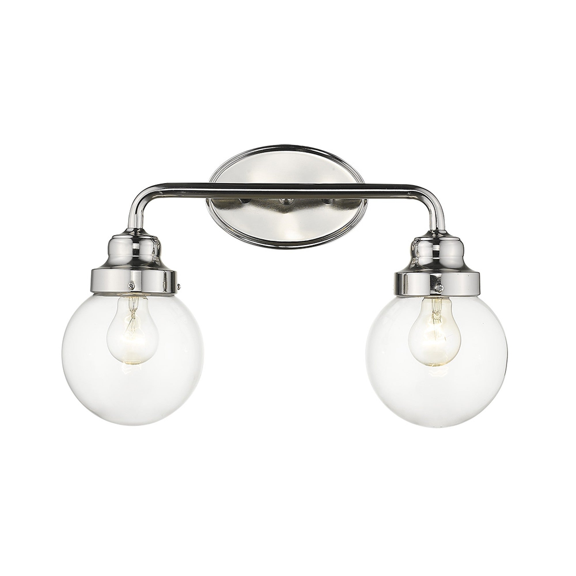 Elevate the look of any space in your home with this Two-Light Silver Wall Sconce with Round Glass Shade. This classy piece features a round wall bracket which has a downward pointing swing arm attached to it. The swing arm attaches to the top of each light which have a two-step design. The hardware is colored to a shiny silver color. The light shades are made of clear glass and have a fishbowl inspired design. This minimal wall sconce will look great on its own as a statement fixture or you can use a group of these sconces to update the look of any room. 11.75" H x 18" W x 6.75" D