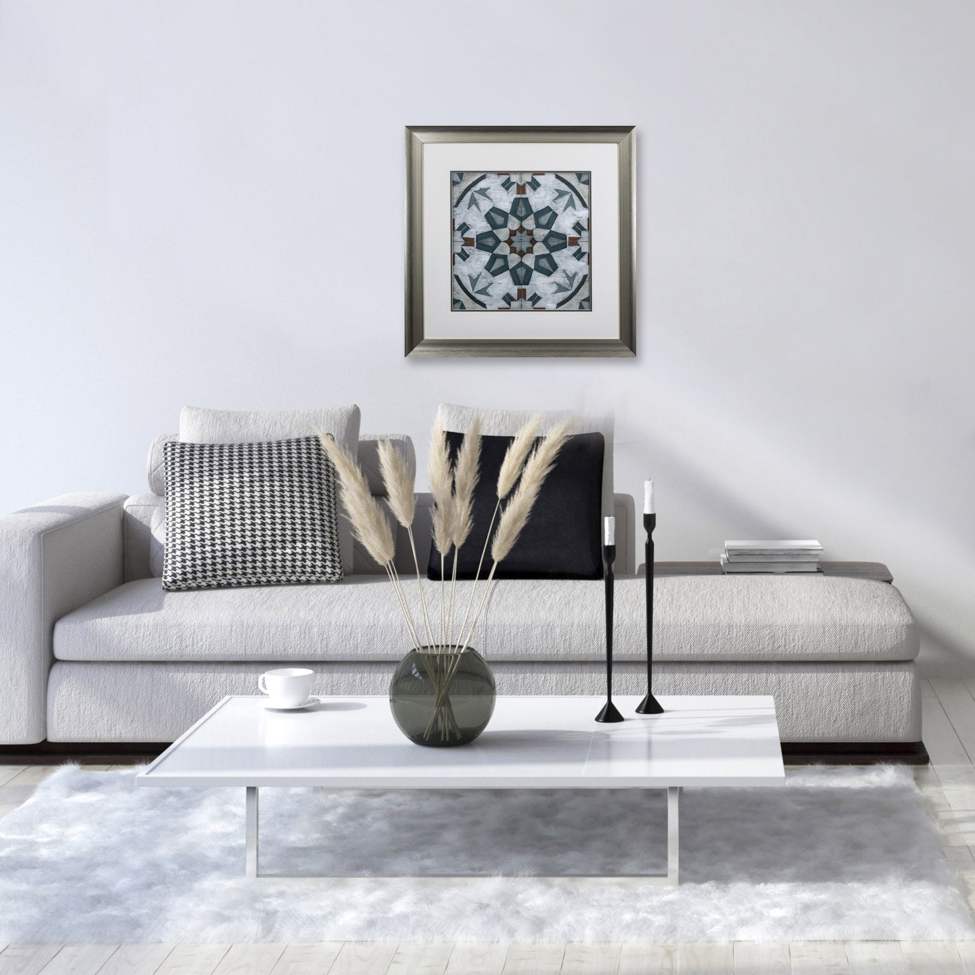This Verdigris Tile I Framed Art will be a great accent for your favorite space. This tile-inspired image comes double matted and framed under glass, bordered in high-quality brushed silver frame. This neutral design will make a perfect way to liven up your space. 30" x 30" x 1" each. Set of 2