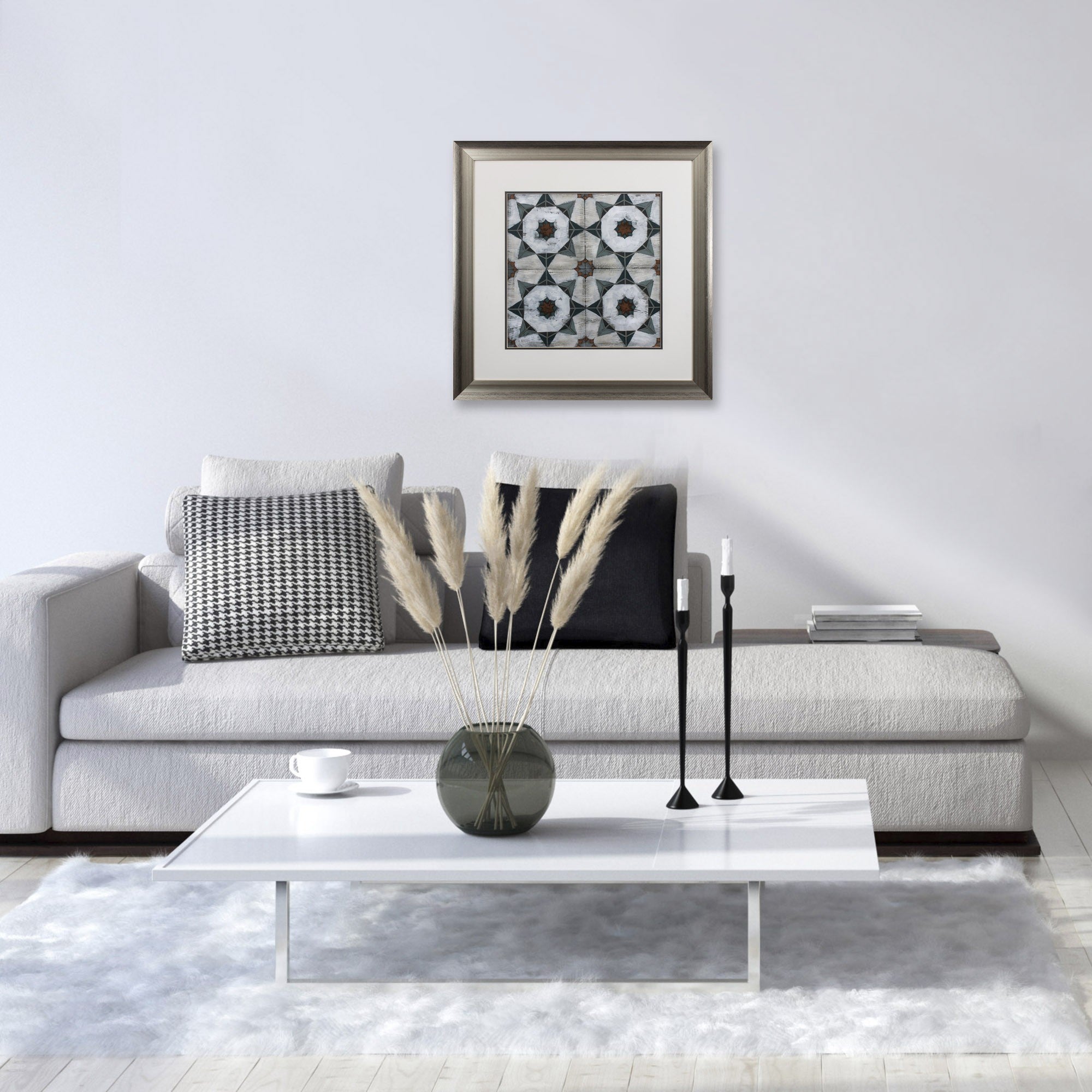 This Verdigris Tile II Framed Art will be a great accent for your favorite space. This tile-inspired image comes double matted and framed under glass, bordered in high-quality brushed silver frame. This neutral design will make a perfect way to liven up your space. 30" x 30" x 1" each. Set of 2