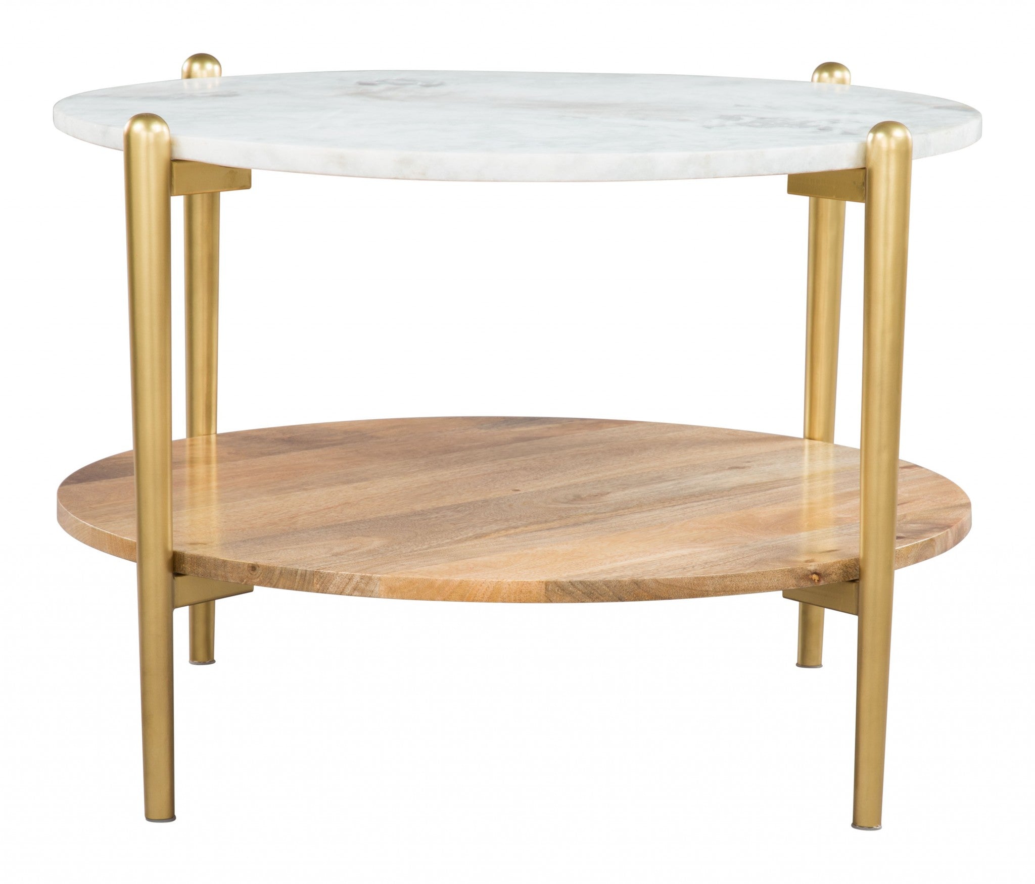 This White and Gold Marble Top Table is the perfect way to add a touch of neutral design to your living room. The frame of the table is made from solid steel and is colored to a dull gold finish. The frame has hooks for holding the table tops up and so has a two tier design to it. The bottom shelf is made of solid wood and has a thin varnish on it allowing the wooden pattern to show through. The table top is made from white marble which has light gray veining through it. This table is unique and will be the perfect statement piece for your living room. 20" H x 30" W x 30" D