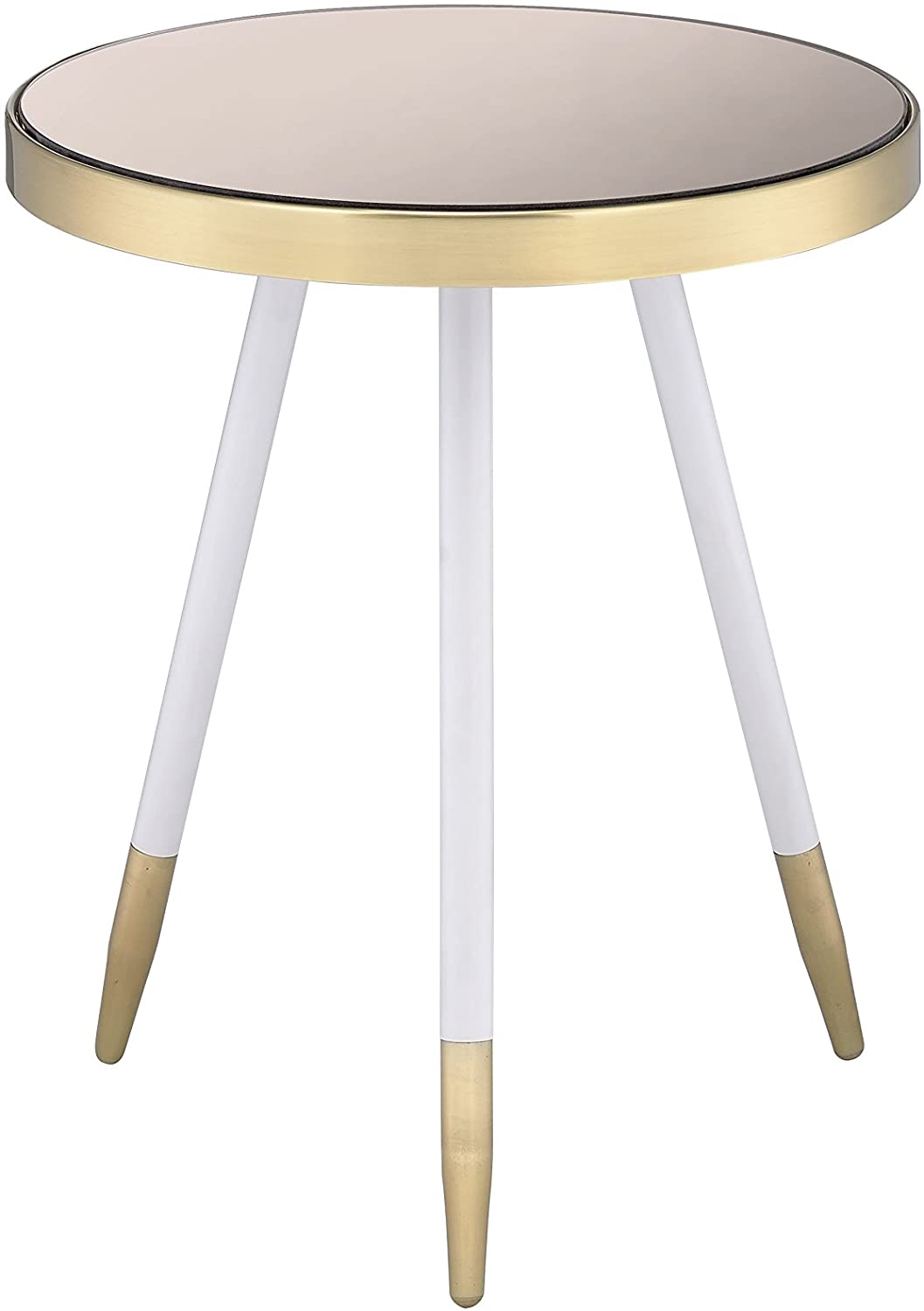 Our White and Gold Smoky Mirror Top Side Table is an elegant addition to modern and bright interiors. Made with a round smoky mirror top and white legs, this chic piece also features a gold table top edge and paint-dipped legs which adds an effortless touch of glamor. 22" X 18" X 18"