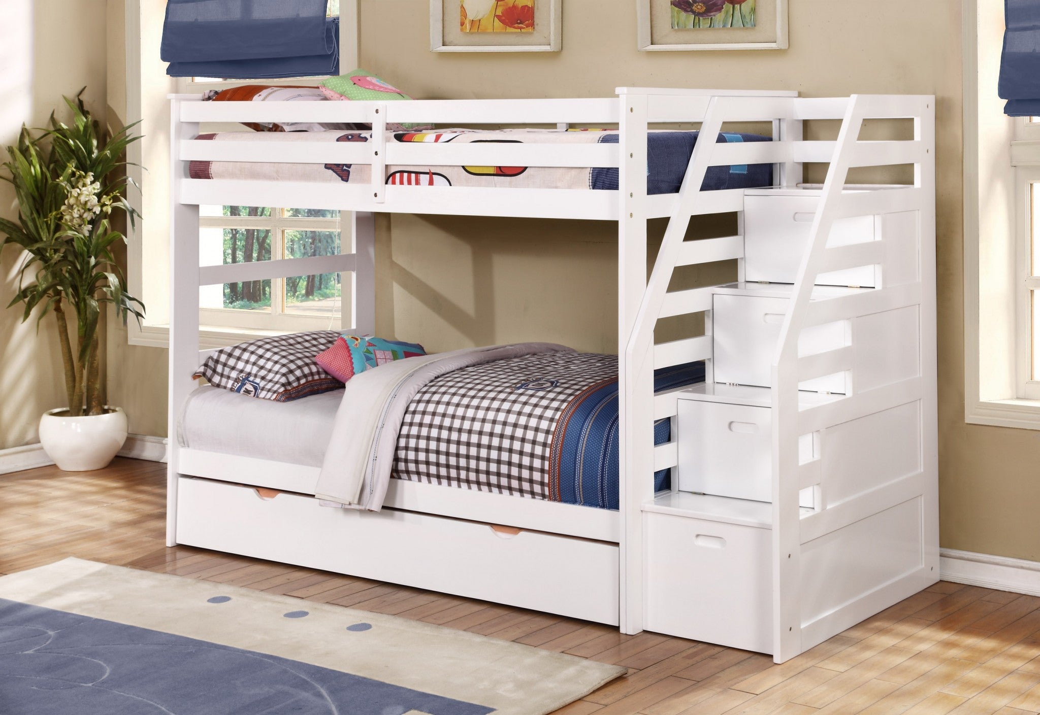 White Finish Twin over Twin Staircase Bunk Bed with Trundle and Storage