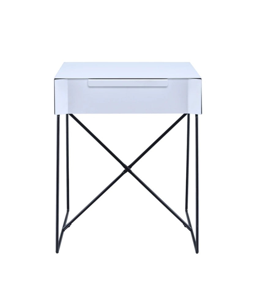 If you're looking to inject a splash of monochrome into your home, then the White Modern Metal End Table the one for you. This stand out piece, while small in size, will add an impactful focal point to any room. It's metal structure is great way of introducing a different texture, while its slimeline drawer compartment provides useful storage too. Complete with black metal legs and X-bar detail, this bold colour combination could work well in a bedroom, living or office space. 22”x 18”x 15”.