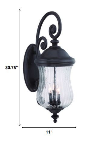 Add more design to the exterior walls of your home with this XL Matte Black Urn Shaped Wall Light. The wall bracket is in an oval shape and has a curved spiral rod attached to it. The rod attaches to the top of the main body of the light. The light has a domed top with an urn shaped glass globe in the middle. capped by an ornament shape at the bottom. The glass globe has a striped design on it and a slight raindrop pattern. This light will look great in your front porch, your backyard, or even on your shed or garage wall. 30.75" H x 11" W x 16.75" D