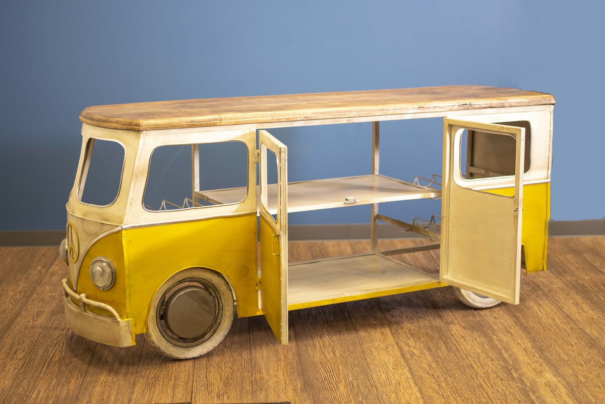 Create a unique display in your dining or bar area with our peace bus bar, a reminiscent of Classic Classic Hippie Van. It comes with a unique surface for serving wine and sufficient storage for your bar items. Colored in yellow and white with an antique profile, this bar also serves as a stunning piece for your décor. It is made of metal and mango wood and is built to stand the test of time. Comes in assorted colors of red, green and yellow. Actual dimension: 87.5" x 26.5" x 39.5". This product is not licensed by Volkswagon (VW) and does not have any Volkswagon (VW) trademarked logo on it.